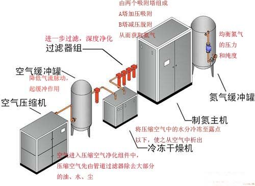 制氮機(jī)制氮過(guò)程中空壓機(jī)是必不可少的一個(gè)環(huán)節(jié),空氣中含氮,空壓機(jī)將空氣壓縮,進(jìn)入配套的儲(chǔ)氣罐,大部分油、液態(tài)水、灰塵附著于容器壁后流到罐底并定期從排污閥排出,一部分隨氣流進(jìn)入到壓縮空氣凈化系統(tǒng)。